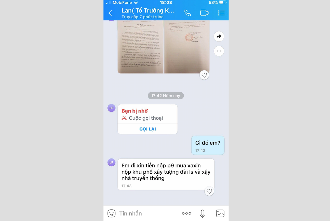 Tin Saigon.- Ngày 21 tháng 6 năm 2021, trên trang Facebook của bác sĩ Đinh Đức Long loan tin, một cựu sĩ quan quân đội Cộng sản có 40 năm tuổi đảng đã nhắn tin cho ông rằng, bà mới bị viên chức phường 9, quận Gò Vấp, Sài Gòn nơi bà ở nhắn tin “xin” tiền cho 3 khoản là: ủng hộ quỹ vaccin Covid 19, ủng hộ tiền xây tượng đài liệt sĩ, và tiền sửa lại nhà truyền thống.
