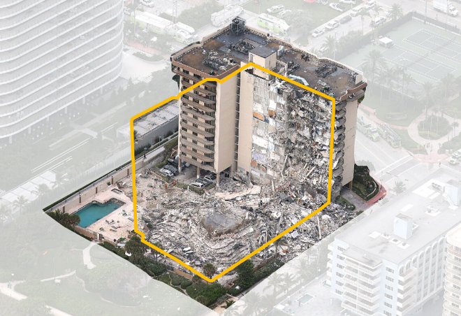 Theo như giới chức cho biết những hình ảnh cho thấy tòa chung cư 12 tầng Champlain Towers trên đại lộ Collins ở thị trấn Surfside , phía bắc Miami Beach , nhìn từ trên cao xuống, trước khi nó bị sập xuống, biến thành đống gạch vụn màu xám khổng lồ, với những bức ảnh chụp trước và sau khi chung cư 12 tầng ở bang Florida, Mỹ đổ sập hôm 24/6 đã cho thấy mức độ nghiêm trọng của vụ việc.