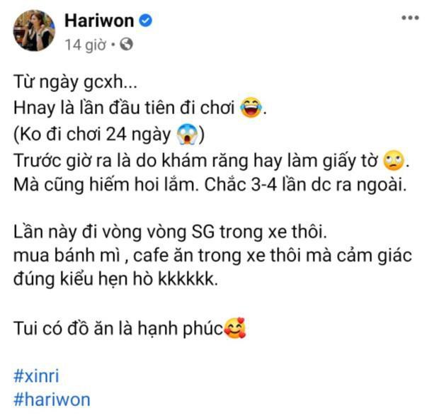 Kết quả là Hari Won bèn đính chính một cách khéo léo. Cô tâm sự "Từ ngày giãn cách xã hội, hôm nay là lần đầu tiên đi chơi (Không đi chơi 24 ngày). Lần này đi vòng vòng Sài Gòn trong xe thôi. Mua bánh mì, cafe, ăn trong xe thôi mà cảm giác đúng kiểu hẹn hò. Tui có đồ ăn là hạnh phúc".