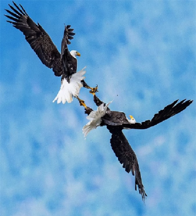 Những bức ảnh cảnh đại bàng hói 'kịch chiến' với đồng loại trên không trung đẹp nao lòng. Trong đó có cảnh con đại bàng hói treo lủng lẳng đối thủ trên không trong cuộc chiến kịch tính với đồng loại.