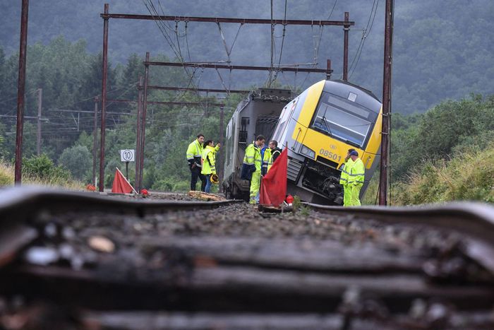 Nhân viên đường sắt có mặt tại hiện trường tàu bị trật đường ray sau khi mưa lớn xuất hiện ở Rochefort, Bỉ. (Ảnh: Getty Images)