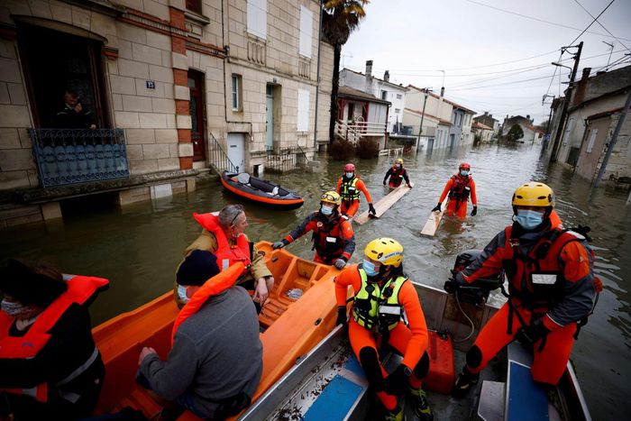 Nhân viên cứu nạn sử dụng thuyền nhỏ để đưa người dân tại vùng bị ngập úng gần sông Charente, đoạn chảy qua Saintes, Pháp, tới nơi an toàn. (Ảnh: Reuters)