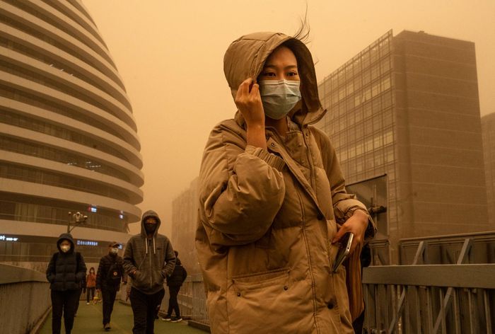 Người dân Bắc Kinh di chuyển trong cơn bão cát và gió lớn. (Ảnh: Getty Imges)