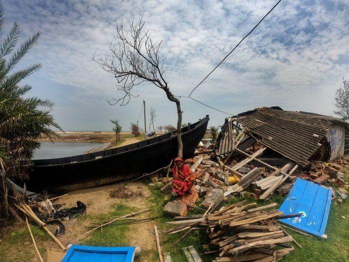 Người phụ nữ ngồi bên ngôi nhà tan hoang sau bão Yaas. Hình ảnh tại Kolkata, Ấn Độ. (Ảnh: Shutterstock)