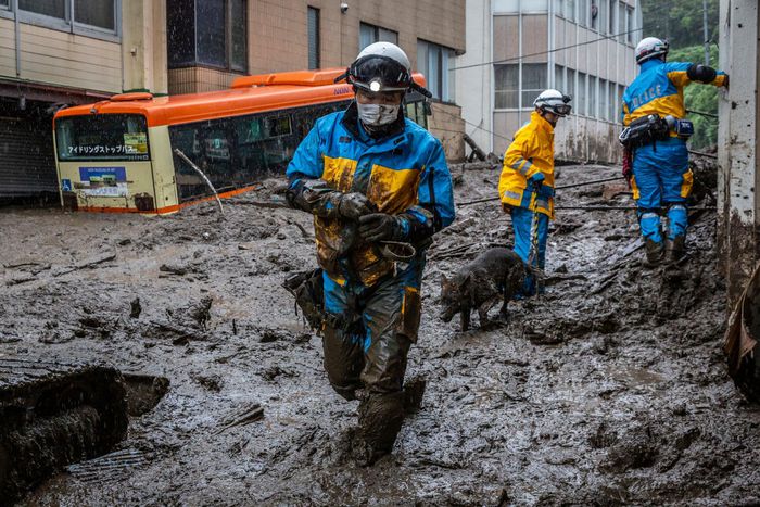 Với sự hỗ trợ của chó nghiệp vụ, cảnh sát kiểm tra khu vực chung khoanh nơi xảy ra lở đất tại Atami, Shizuoka, Nhật Bản. (Ảnh: Getty Images)