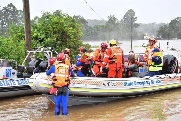 Lực lượng khẩn cấp sơ tán một gia đình ra khỏi khu vực ngập úng tại TP Upper Colo, Australia. (Ảnh: EPA)