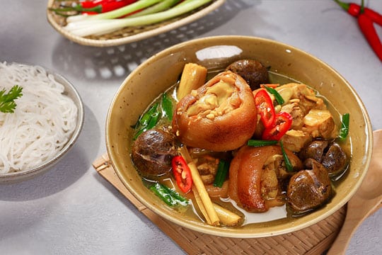 Múc ra chân giò ra tô, thêm hành lá, ớt cắt lát. Dùng nóng với bún hoặc cơm, chấm nước mắm ớt.