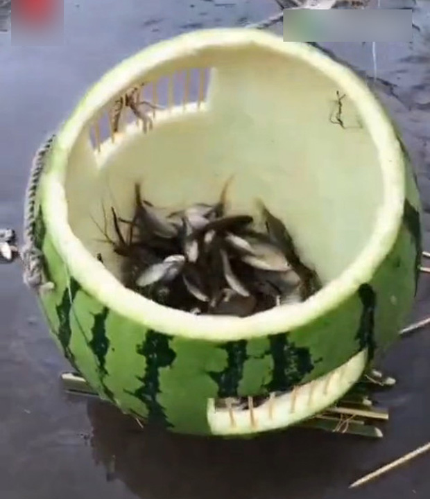Dưa hấu là loại quả phổ biến, giá rẻ, đang vào mùa. Một anh chàng nọ bèn chọn một trái khá lớn, ăn khéo sao cho khoét được hết phần ruột đỏ bên trong, để phần cùi và vỏ tạo thành một khoang rỗng. Sau đó thêm vài thao tác để biến thành lồng bắt cá.