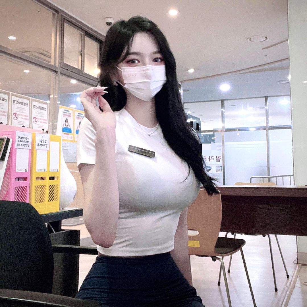Mới đây, hình ảnh của cô gái Hàn Quốc trong chiếc áo thun bó được đăng tải nhiều trên mạng xã hội với lời ngợi khen cô nhân viên quyến rũ. Người đẹp chọn diện thiết kế áo ôm đơn giản màu trắng khéo tôn được lợi thế vòng 1.