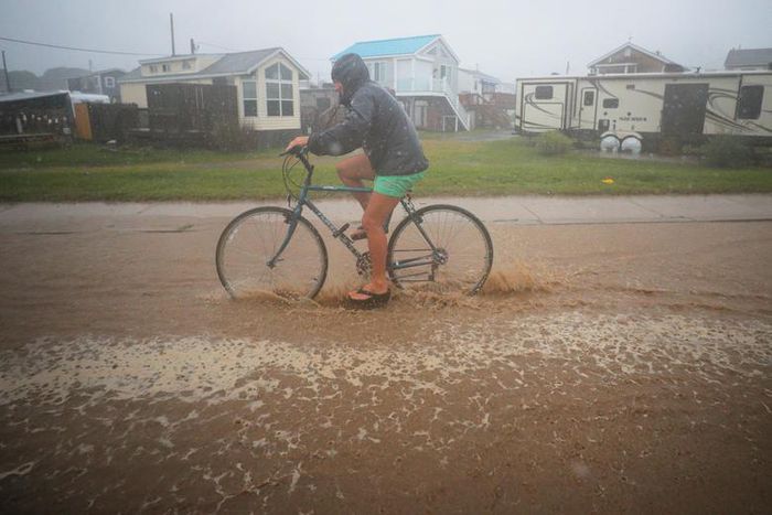 Một người đạp xe qua con đường ngập lụt ở South Kingstown, Rhode Island, ngày 22/8. Ảnh: Reuters.