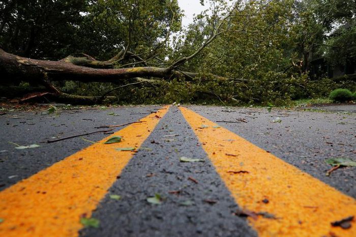 Cây đổ chắn ngang đường ở Newport, Rhode Island, ngày 22/8. Ảnh: Reuters.