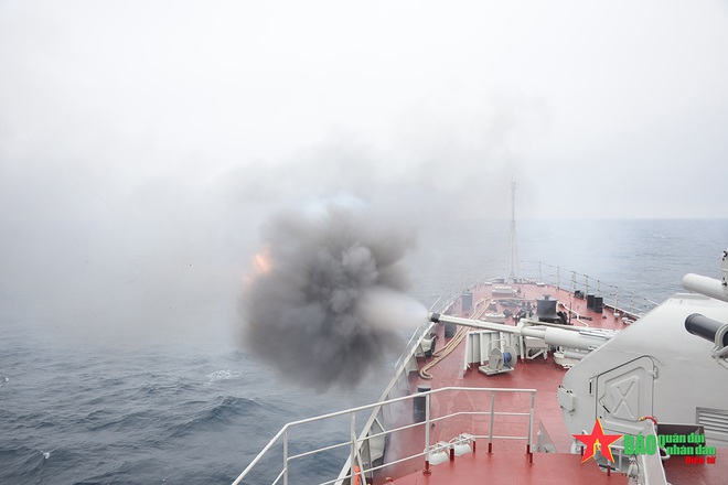 Pháo AK 176 trên Tàu 016-Quang Trung khai hỏa tiêu diệt mục tiêu trong bài thi.