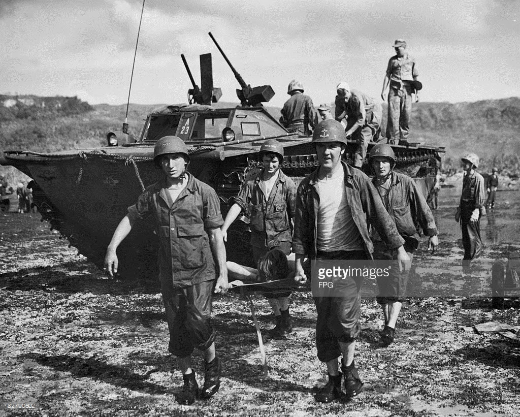 Lính Mỹ bị thương được đồng đội cáng ra tàu quân y.