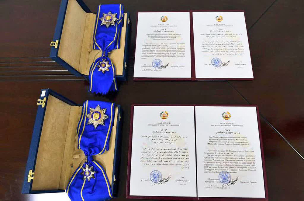 Các Huân chương Ismoili Somoni Hạng nhất truy tặng cho cựu Bộ trưởng Quốc pḥng Afghanistan Ahmad Shah Massoud và cựu tổng thống Afghanistan Burhanuddin Rabbani..