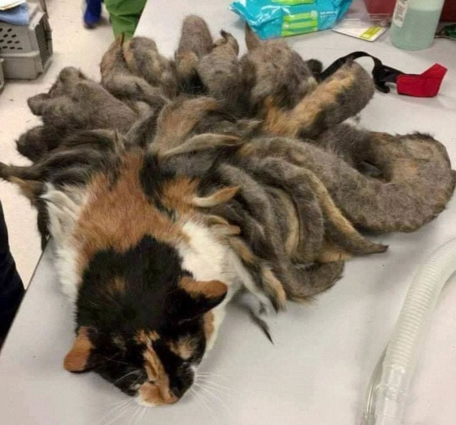 "Con mèo đáng thương này đã được đem đến bệnh viện của chúng tôi sau khi chủ nó được đưa đến nhà dưỡng lão. Trên người nó là những cuộn lông bết lại, có vẻ như nó đã bị bỏ mặc trong nhiều năm.