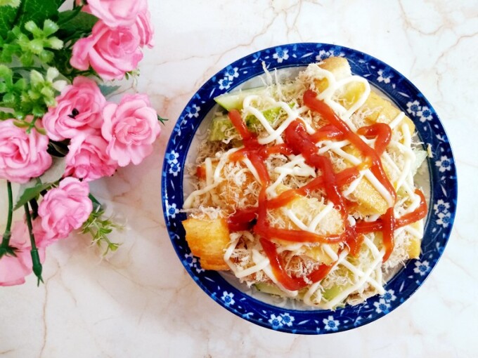 Từng miếng bánh mì giòn ngon, thêm ruốc. Thấm đều gia vị xốt chanh leo chua chua ngọt ngọt vừa miệng. Mà ăn không bị ngán.