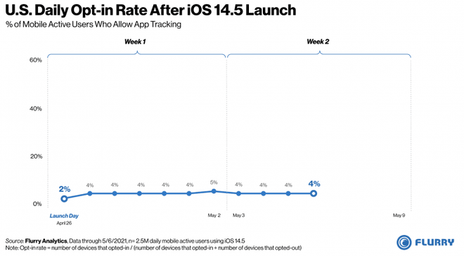 Cụ thể, báo cáo cho biết chỉ có 4% người dùng Mỹ đồng ý cho phép các ứng dụng theo dõi. Con số toàn cầu cao hơn đáng kể ở mức 12%, nhưng vẫn thấp hơn ước tính của một số công ty quảng cáo. Con số toàn cầu này dựa trên kích thước mẫu của 5,3 triệu người dùng iOS 14,5 hoạt động hàng ngày.