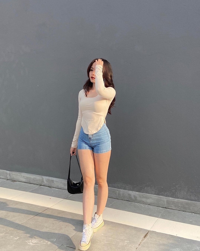 Hot girl Quảng Ninh Dạ thảo chọn mặc quần short cạp cao cùng áo dáng ngắn.