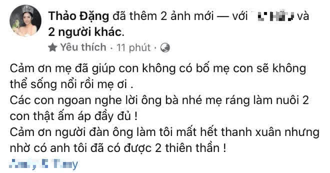 Giữa lùm xùm, vào chiều ngày 6/11, Đặng Thu Thảo có động thái nhắc đến chồng cũ. Trên trang cá nhân, cô viết: "Cảm ơn mẹ đã giúp con, không có bố mẹ con sẽ không thể sống nổi mẹ ơi. Các con ngoan nghe lời ông bà nhé, mẹ ráng làm nuôi 2 con thật ấm áp, đầy đủ! Cảm ơn người đàn ông làm tôi mất hết thanh xuân nhưng nhờ có anh, tôi đã có được 2 thiên thần!" Hiện tại, nàng hậu đã chuyển lên Sài Gòn làm việc. 2 nhóc tỳ sinh đôi của cô hiện đang được ông bà ngoại chăm sóc.