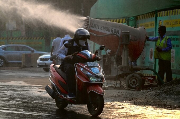 Người dân đi qua một súng phun sương chống khói mù để hạn chế ô nhiễm ở New Delhi ngày 16/11. Ảnh: AFP