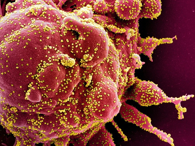 H́nh ảnh biểu thị các tế bào khoẻ mạnh (màu đỏ) bị nCoV (màu vàng) xâm nhập. Ảnh: NIH