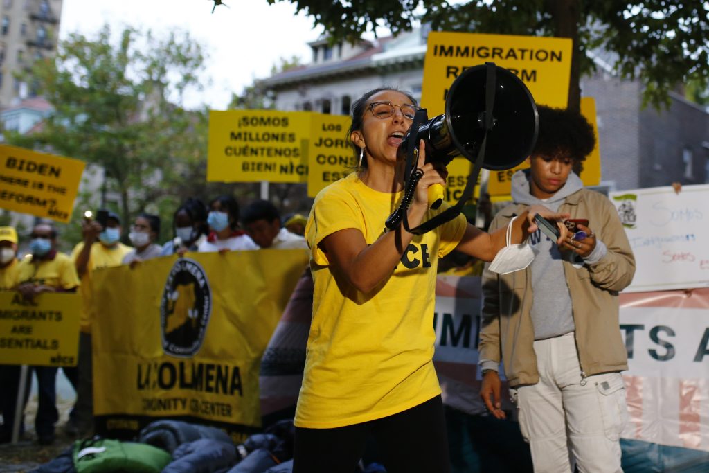 Một cuộc biểu t́nh của tổ chức New Immigrant Community Empowerment (NICE) tụ tập bên ngoài tư dinh Thượng nghị sĩ Dân chủ Chuck Schumer (Brooklyn, New York City) ngày 5 Tháng Mười 2021, kêu gọi “mở đường” cho việc cấp quốc tịch đối với người nhập cư hợp pháp (ảnh: Michael M. Santiago/Getty Images)