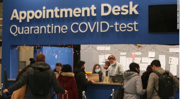 Hành khách xét nghiệm Covid-19 tại sân bay Schiphol ở Amsterdam, Hà Lan ngày 28/11/2021. (Ảnh: CNN)