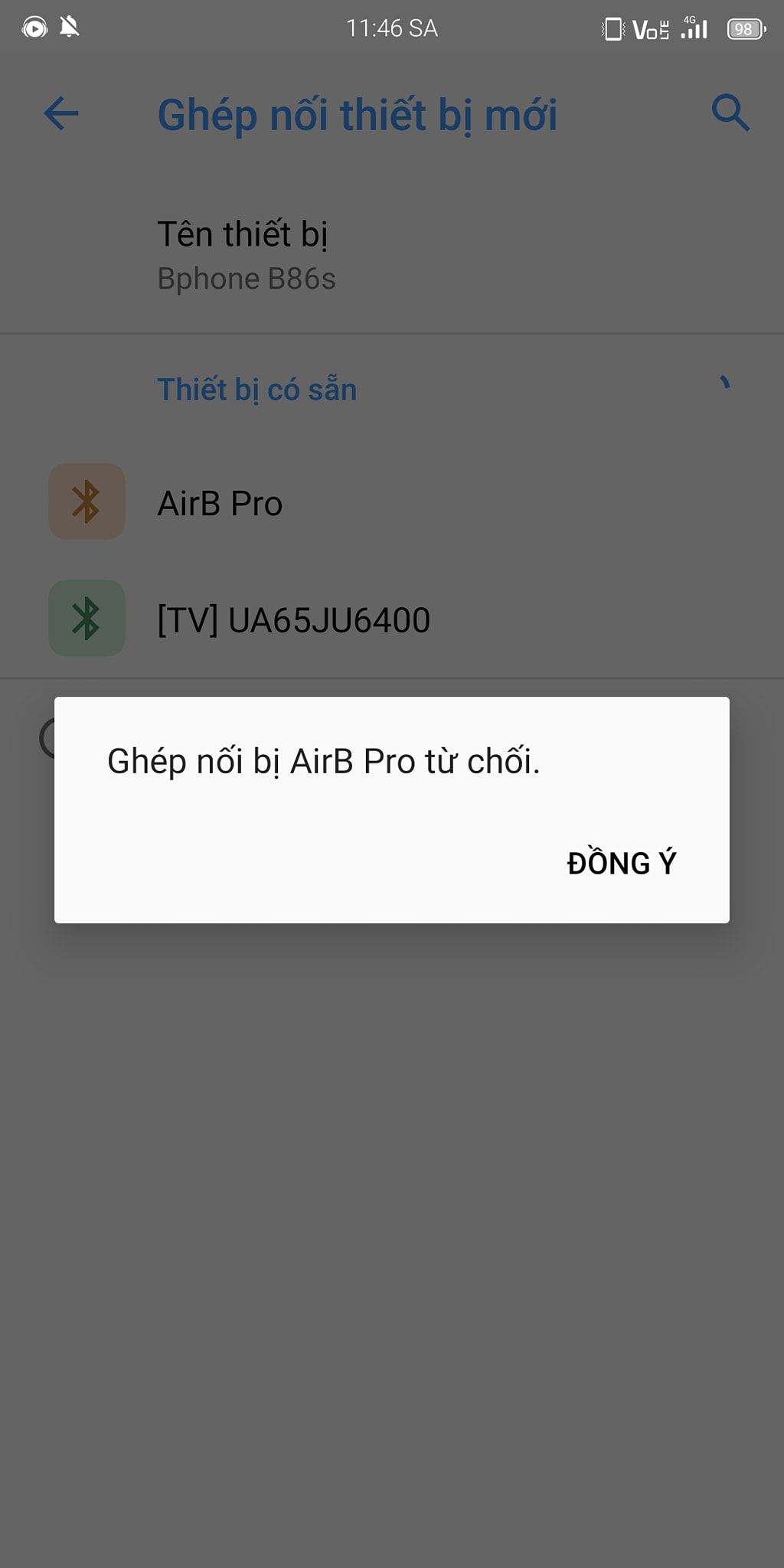 Bên cạnh đó, không ít người dùng gặp phải lỗi không thể ghép nối tai nghe AirB và AirB Pro với smartphone. Khi bật Bluetooth và cố gắng ghép nối, thông báo lỗi "Ghép nối bị AirB Pro từ chối" xuất hiện.