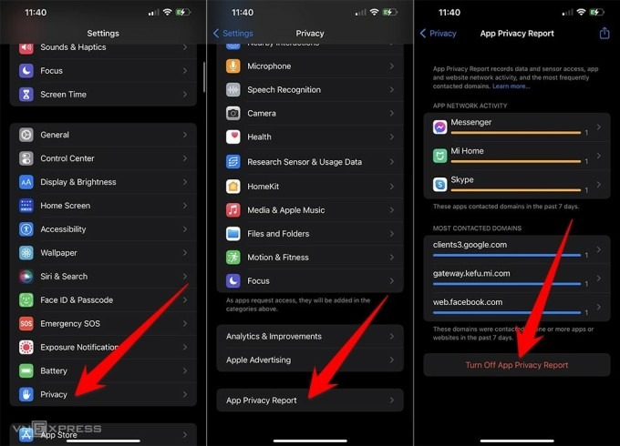Tính năng App Privacy Report, khi được kích hoạt, sẽ ghi lại mỗi khi một ứng dụng truy cập vào dữ liệu nhạy cảm như ảnh, vị trí, thông tin liên hệ hay khi camera, microphone được sử dụng. Công cụ lưu lại lịch sử hoạt động của các ứng dụng trong vòng 7 ngày.