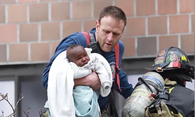 Lực lượng cứu hộ đưa một em bé trong tòa nhà bị cháy ở New York ra ngoài hôm 9/1. Ảnh: NY Post