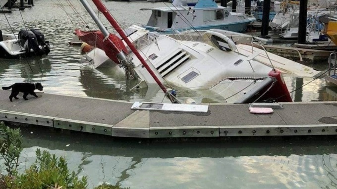 Một chiếc thuyền ở bến thuyền Tutukaka, Northland, New Zealand bị chìm sau khi sóng thần ập vào đêm 15/1. Ảnh: Stuff.