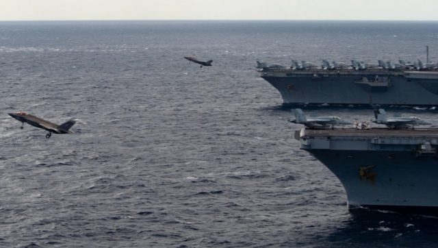 Chiến đấu cơ F-35C cất cánh từ hai siêu tàu sân bay USS Carl Vinson và USS Abraham Lincoln ở biển Philippines ngày 22-1. Ảnh: Hải quân Mỹ