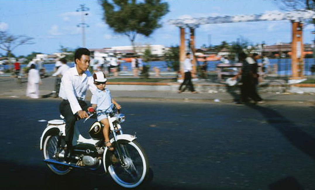 Đứa bé được đặt ngồi trên bình xăиg của chiếc moto – Chiếc xe đang chạy ngang đoạn bến Bạch Đằng, gần với Công trường Mê Linh.