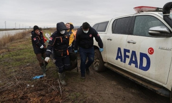 Nhân viên y tế khiêng xác người di cư ở Ipsala, gần biên giới Thổ Nhĩ Kỳ - Hy Lạp, hôm 2/2. Ảnh: Anadolu Agency.