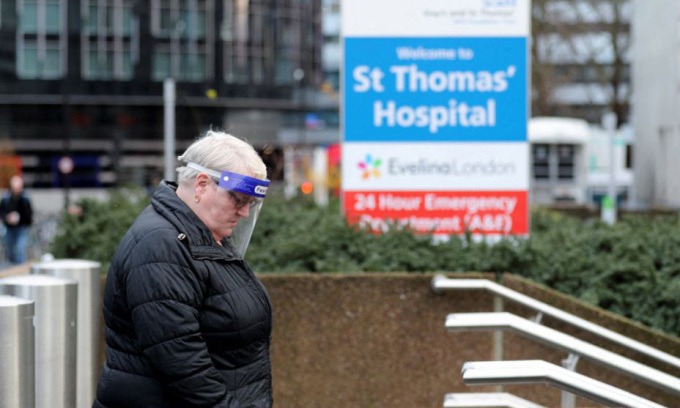 Một người đeo kính chắn giọt bắn đi qua bệnh viện St. Thomas ở London, Anh, hồi tháng 12/2021. Ảnh:Reuters.