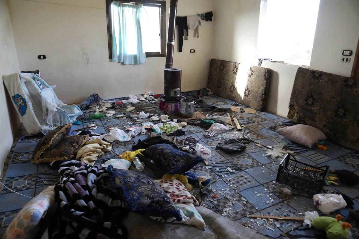 Đồ vật của trẻ nhỏ bày la liệt bên trong ṭa nhà: Một chú thỏ nhồi bông, một chiếc xích đu bằng nhựa màu xanh lam, một cái cũi. Vũ khí cũng vậy, chẳng hạn như quả bom mà Abu Ibrahim al-Hashimi al-Qurayshi dùng để tự sát, kéo theo cái chết của gia đ́nh và những người xung quanh.