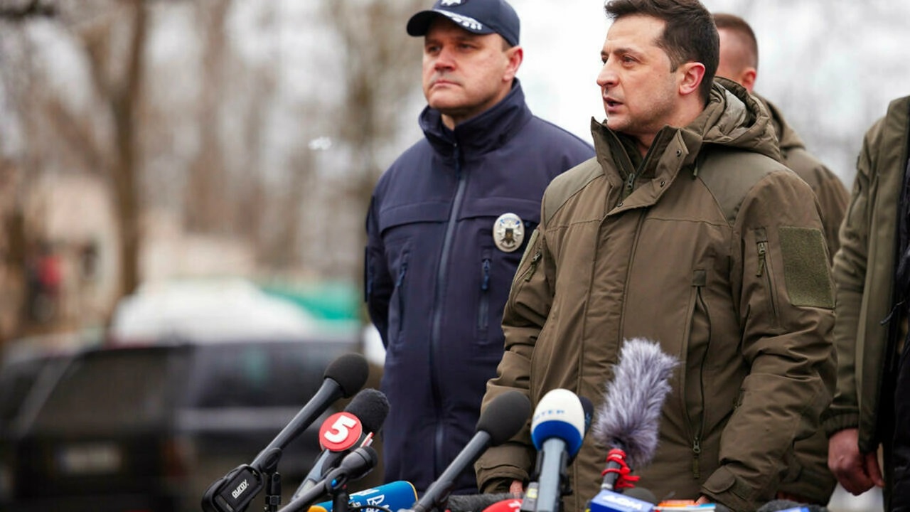 Tổng thống Vlodymyr Zelensky phát biểu trước báo chí trong chuyến đi thị sát t́nh h́nh ở miền nam Ukraina, ngày 12/02/2022. AP