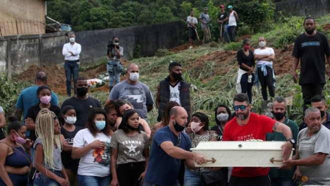 Người thân và bạn bè viếng gia đình có mẹ và hai con tử nạn do mưa lớn và sạt lở đất ở Petropolis, Brazil. Ảnh: REUTERS