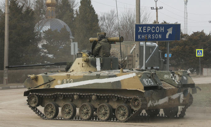 Sau vài ngày giao tranh, lực lượng Nga hôm 2/3 tiến vào Kherson, thành phố lớn đầu tiên tại Ukraine mà họ kiểm soát được. Thị trưởng Kherson Igor Kolykhayev cho biết một nhóm binh sĩ Nga vũ trang đă vào ṭa thị chính, thông báo với ông rằng họ sẽ thiết lập một chính quyền mới tương tự chính quyền hai vùng ly khai ở miền đông Ukraine.