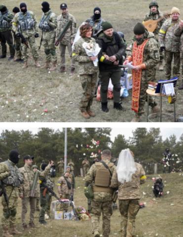 Không váy trắng, hoa cưới hay tiệc rượu. Mặc trong mình bộ quân phục. Cô dâu Lesya Filimonova và chú rể Valeriy Filimonov tổ chức hôn lễ ngay trên chiến tuyến tại Kiev.