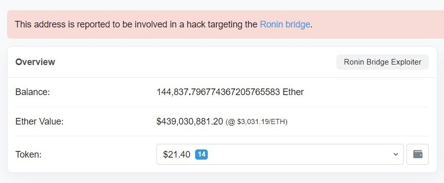 Địa chỉ ví của hacker vẫn chứa hơn 144 ngh́n ETH, tương đương gần 440 triệu USD vào ngày 16/4.