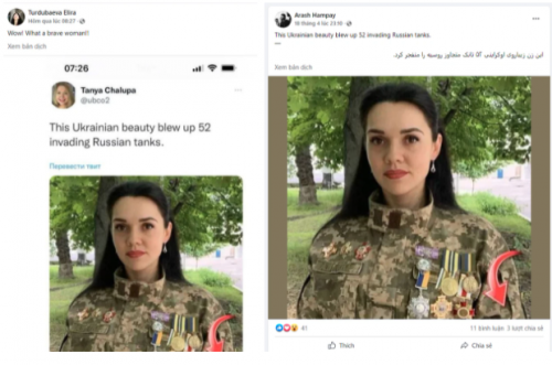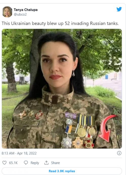 Mới đây, một tài khoản Twitter chia sẻ hình ảnh một phụ nữ mặc quân phục có gắn huy chương của Ukraine cùng chú thích: "Người đẹp Ukraine đã cho nổ tung 52 xe tăng [...] của Nga". Dòng tweet này đã nhận được hơn 65.000 lượt thích kể từ thời điểm đăng tải ngày 18/3/2022.