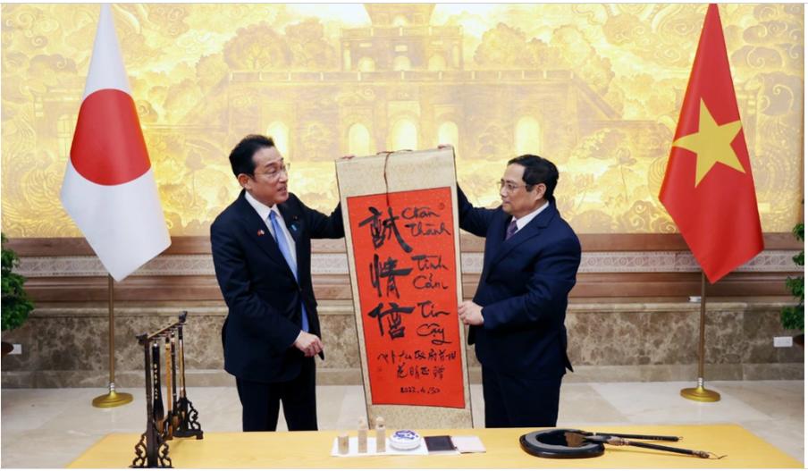 Thủ tướng Phạm Minh Chính tặng bức thư pháp cho Thủ tướng Nhật Bản Kishida. Ba chữ trong bức thư pháp thể hiện chính xác mối quan hệ Việt - Nhật