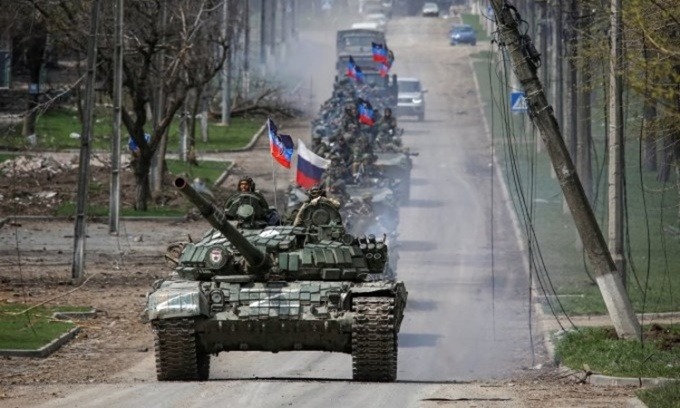 Xe tăng và thiết giáp của lực lượng ly khai thân Nga di chuyển trên đường phố Mariupol, phía đông Ukraine vào giữa tháng 4. Ảnh: Reuters.