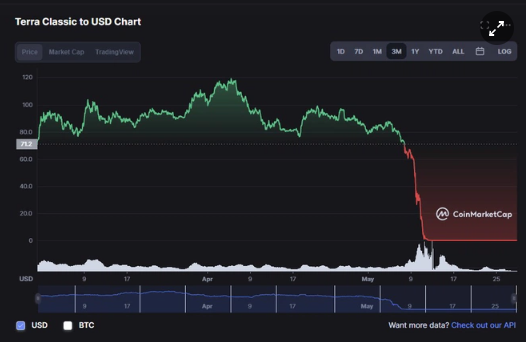 Giá LUNA gần như về 0, nhiều nhà đầu tư mất trắng tài sản. Ảnh: Coinmarketcap.