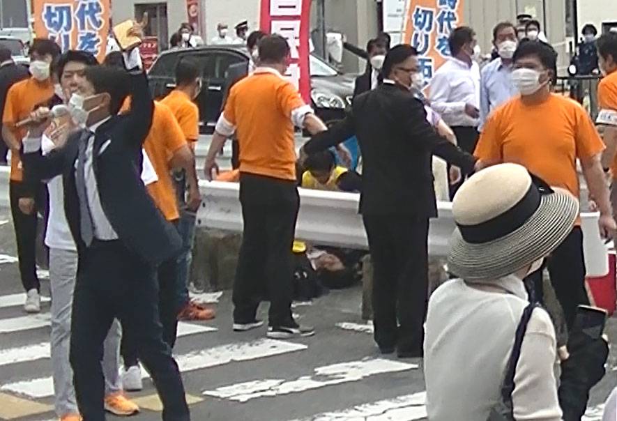 Ông Abe đứng trệc bục cao khoảng 50cm để phát biểu. Phóng viên đài NHK cho biết ông Abe ngã xuống mặt đất sau phát súng thứ hai, đưa tay ôm ngực.