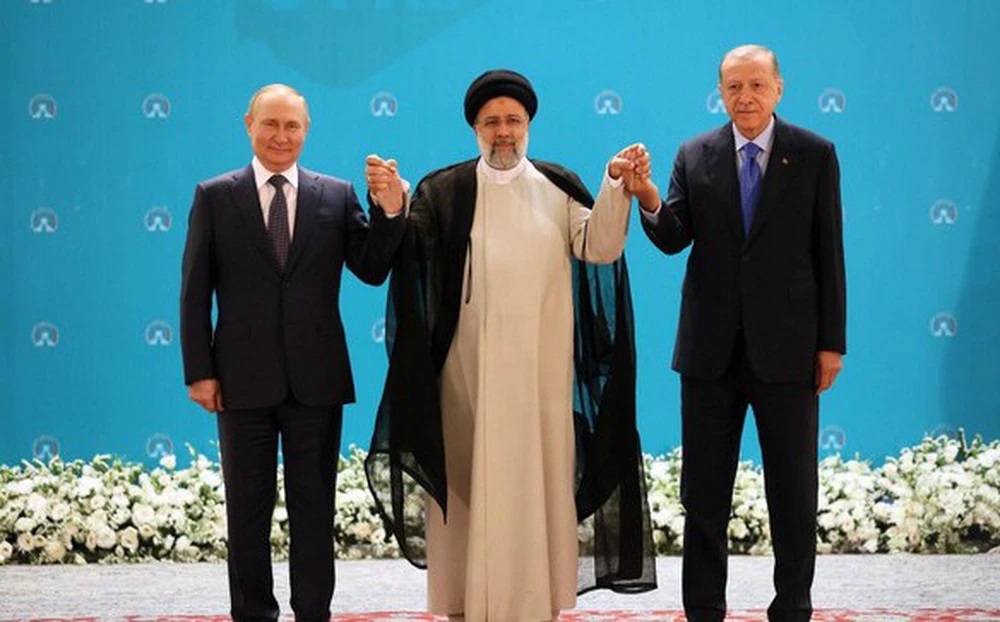 Trong ảnh, ông Putin đứng cạnh Tổng thống Iran - Ebrahim Raisi và Tổng thống Thổ Nhĩ Kỳ Recep Tayyip Erdogan. Ba nhà lãnh đạo nắm tay nhau và mỉm cười.