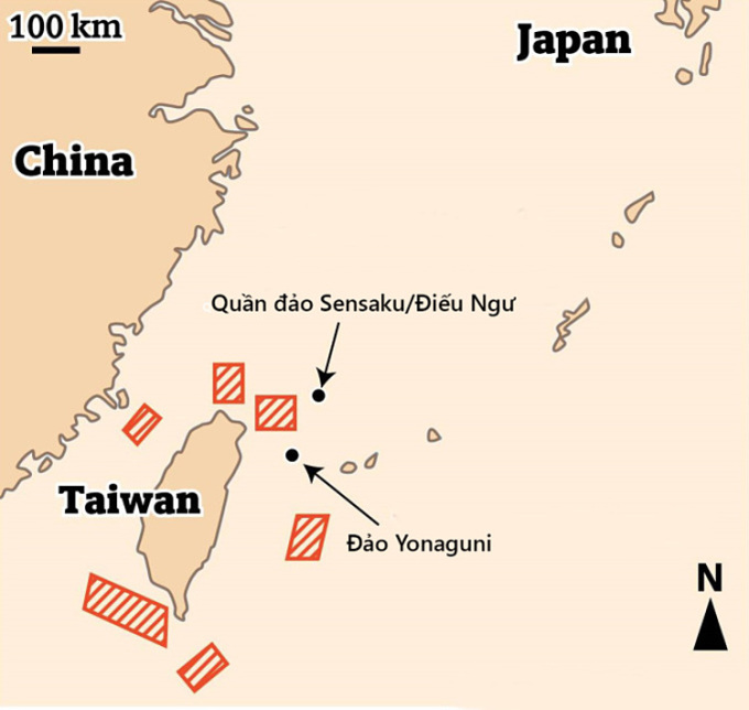 Một số khu vực thuộc đảo cực nam Okinawa của Nhật Bản gần với Đài Loan. Ông Kishi cho biết đây là lần đầu tiên tên lửa đạn đạo Trung Quốc rơi xuống EEZ của Nhật Bản và 9 tên lửa được phóng là con số do phía Nhật đánh giá.