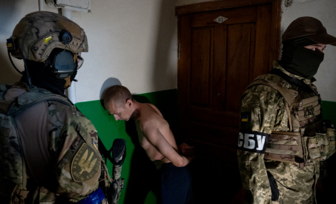 Đặc vụ SBU bắt người đàn ông bị nghi in khẩu hiệu ủng hộ Nga ở tỉnh Kharkov hồi tháng 7. Ảnh: AFP.