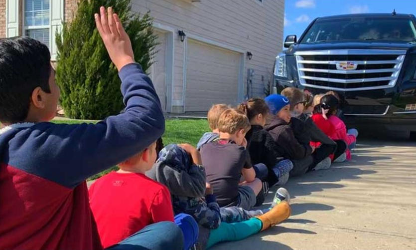 Một hàng dọc gồm 9 đứa trẻ ngồi nối nhau trước đầu chiếc SUV, nhưng nữ tài xế không nhìn thấy gì, chỉ đến khi trẻ thứ 10 ngồi vào.